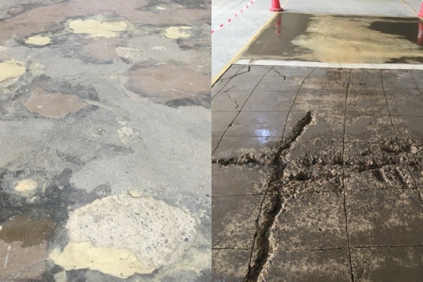 上图展示的地面存在多处小块脱皮以及地面开裂现象,这些小块脱皮区域如果不及时处理,随着时间推移和使用频率增加,会逐渐扩大,最终导致大面积脱落。