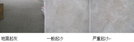 根据地面起沙程度确定单位面积金盾混凝土密封固化剂用量。根据起沙程度将地面分为3种情况,分别为:地面起灰,地面只是不断有灰尘出现,不易清扫;一般起沙,地面有严重起灰情况,同时有沙粒脱落;严重起沙,地面有大量沙粒及骨料脱落。如下图: