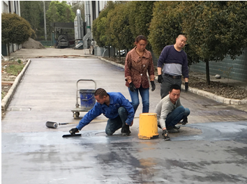将调配好的修补材料倾倒适量在地上用镘刀批刮成2-3mm左右的修复层。如下图: